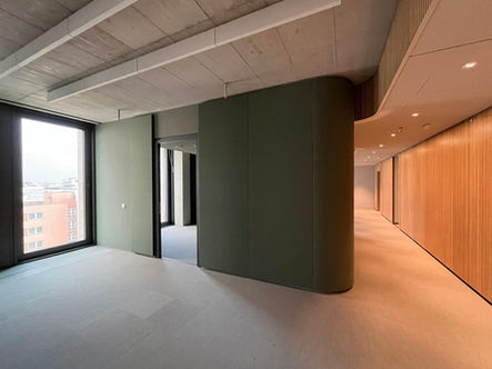 Im Innenausbau erfolgten Trockenbauarbeiten, die Montage von Akustikdecken, Türen und Glaswänden mit 42-dB-Schallschutz, sowie die Verlegung von Teppich- und Keramikbelägen. Auch der Einbau von Brandschutztüren gehörte zum Leistungsumfang.